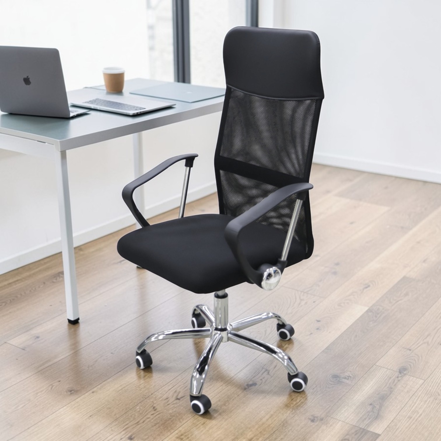 • Комфорт и поддержка: Мягкое сиденье из черного кожзама и эргономичная спинка гарантируют удобство в течение всего дня.