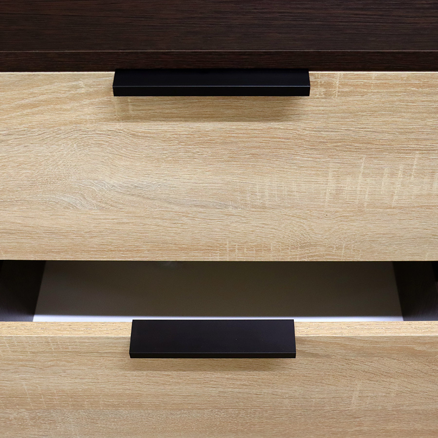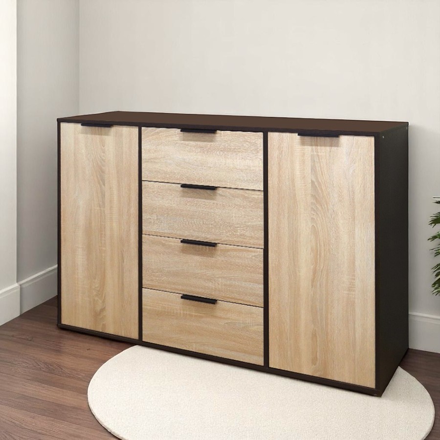 Комод оборудован просторными выдвижными ящиками и двумя дверцами, предоставляя разнообразные возможности для организации хранения. Вместительные ящики прекрасно подойдут для размещения одежды, белья и других личных предметов. Благодаря гармоничному сочетанию древесных оттенков, он будет уместен в любом интерьерном решении.