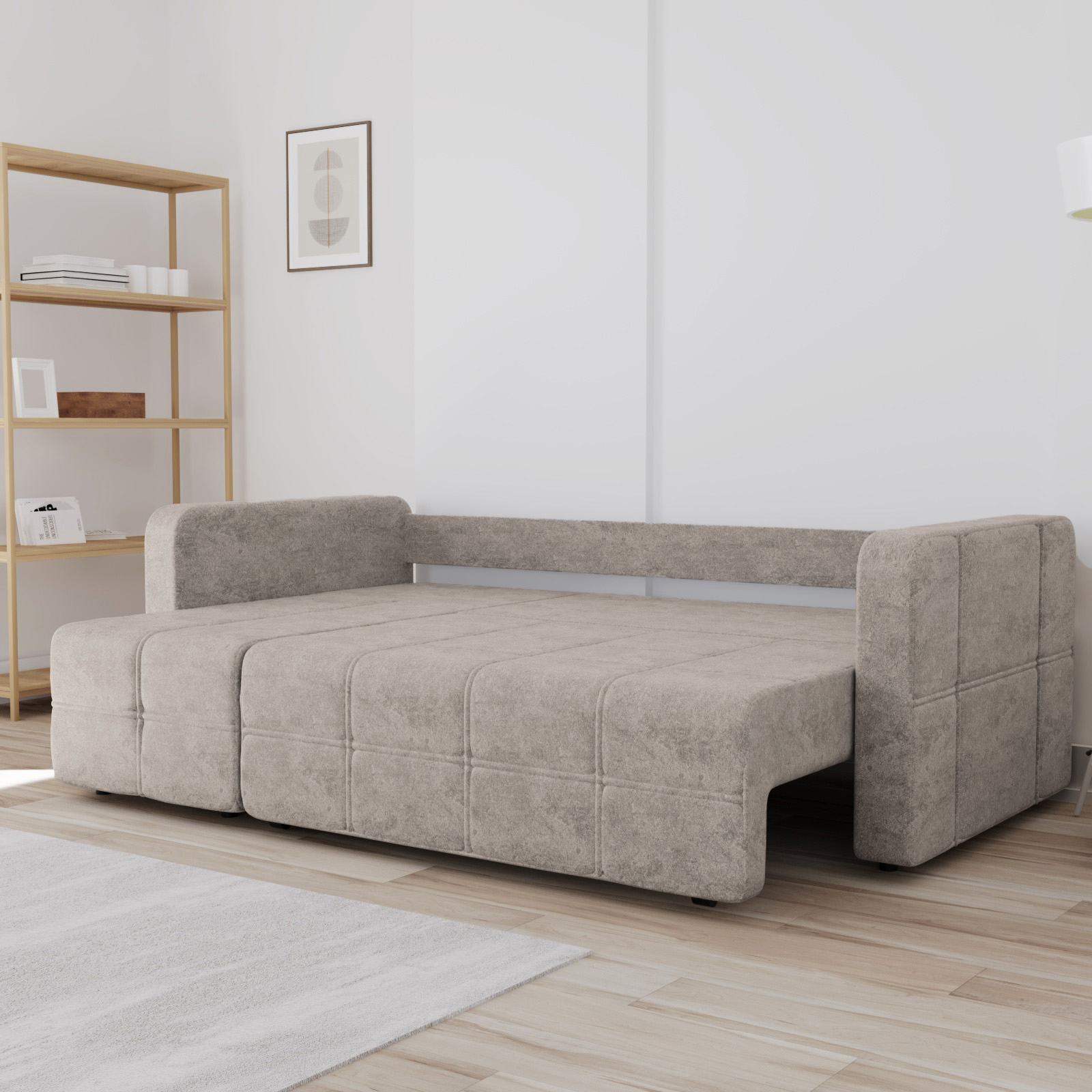 Диван обладает средней жесткостью, что оптимально для комфортного и здорового сна, поддерживая позвоночник. Обивка выполнена из износостойкой ткани, устойчивой к повседневным нагрузкам, что гарантирует дивану опрятный вид на годы.