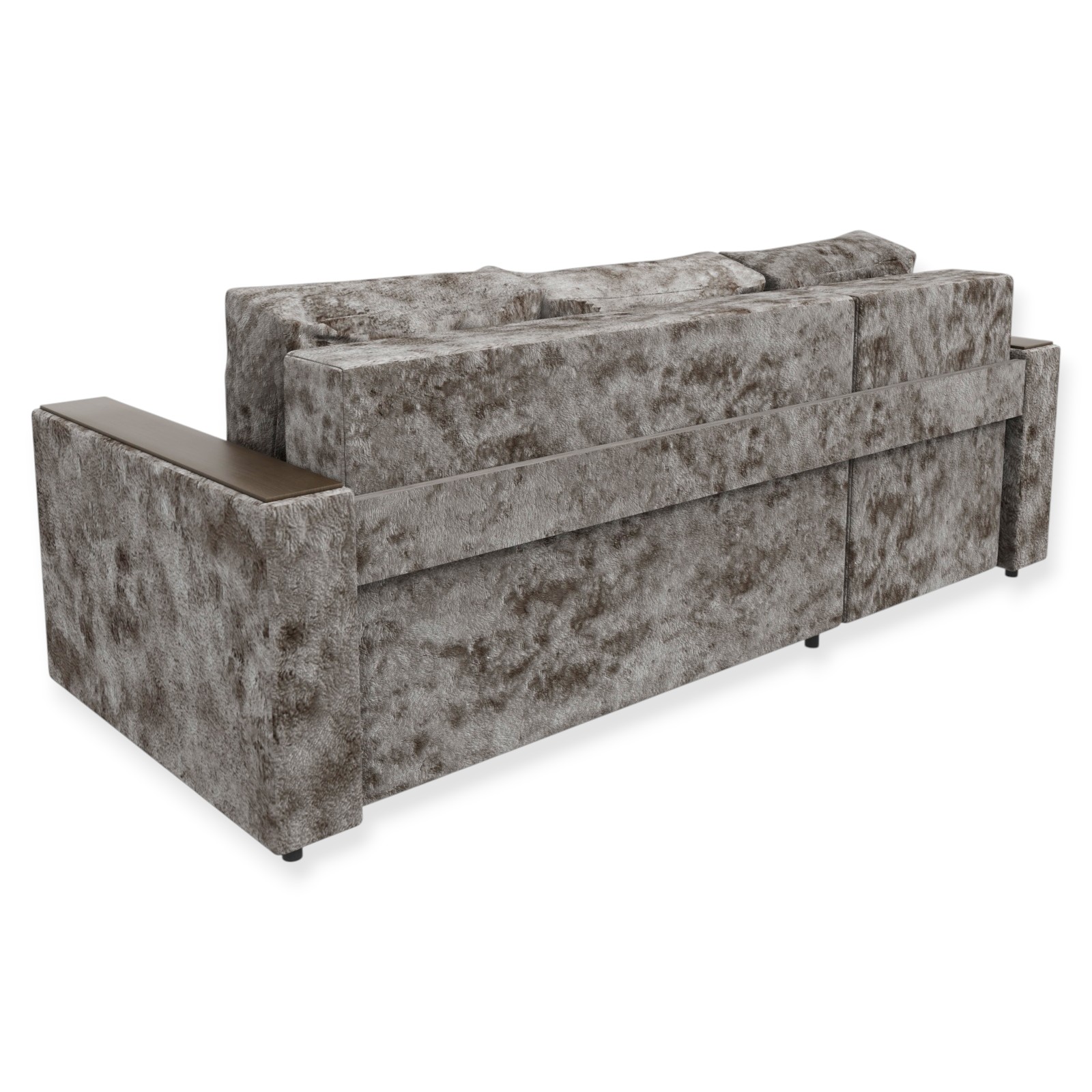 - • Обивка дивана выполнена из износостойкого велюра. Практичного и долговечного материала.