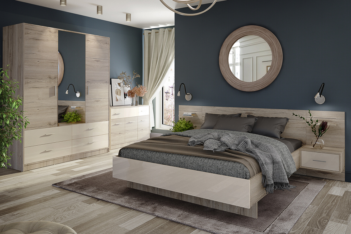 В коллекцию входит: кровать, прикроватная тумба, комод и вместительный шкаф для одежды.