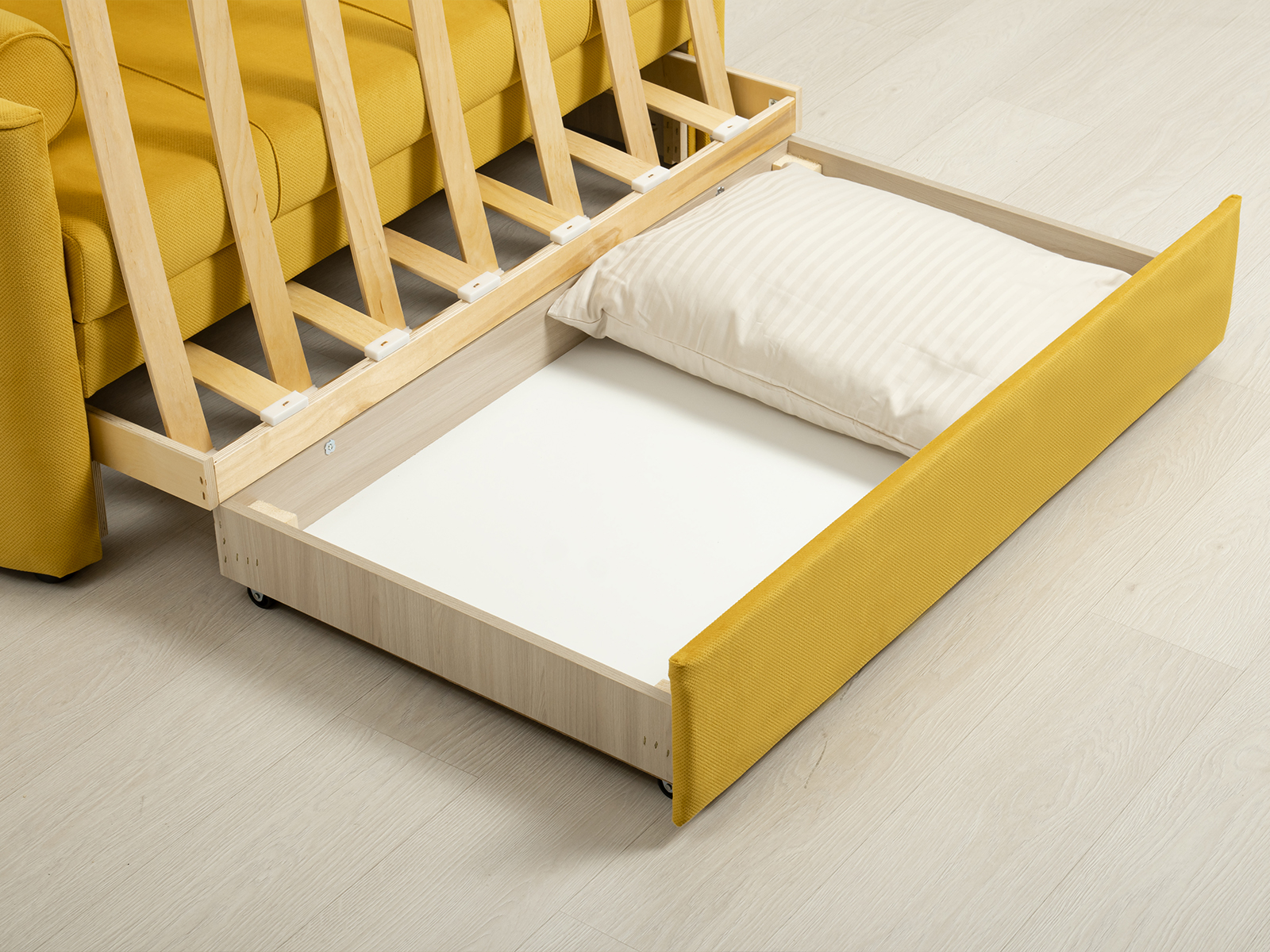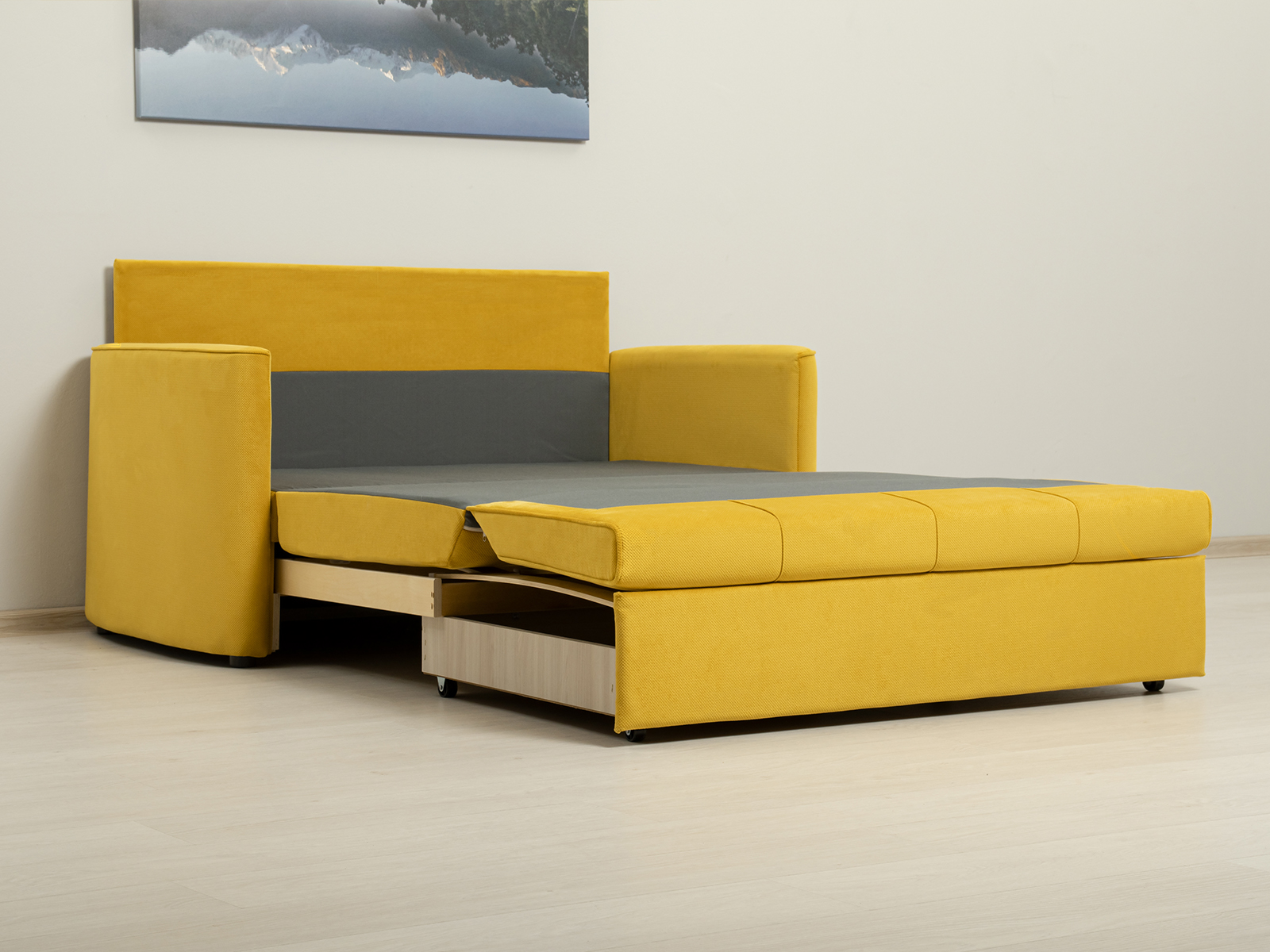Диван-кровать Мелани Р (120) - компактный современный диванчик. Скругленные подлокотники с кантами подчеркивают эргономичность модели. Простой и надежный механизм трансформации на каждый день обеспечит удобным спальным местом ребенка или подростка. Может использоваться в качестве гостевого спального места для взрослого. Размер сп. места 195 х 120 см, есть небольшой бельевой ящик. Диван выполнен в мягком фактурном велюре. "Пальчиковый эффект" на ткани обивки выражен средне. Опоры - цвет черный, круглые, высота 25 мм., выполнены из высококачественного пластика. Прочность конструкции ножек обеспечена ребрами жесткости и внутренним креплением под фурнитуру.