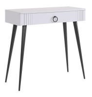 Контрастные оттенки, используемые в оформлении стола, делают его универсальным решением для различных стилей интерьера. Белый цвет фасадов и темные элементы, такие как металлическая фурнитура, добавляют строгости и четкости, что позволяет легко интегрировать этот предмет мебели в любой декор — будь то минимализм, скандинавский стиль или классика.