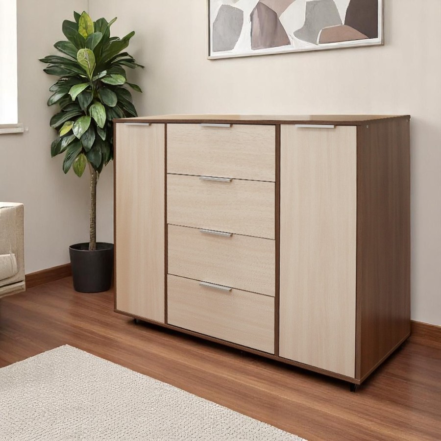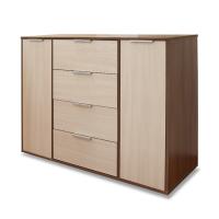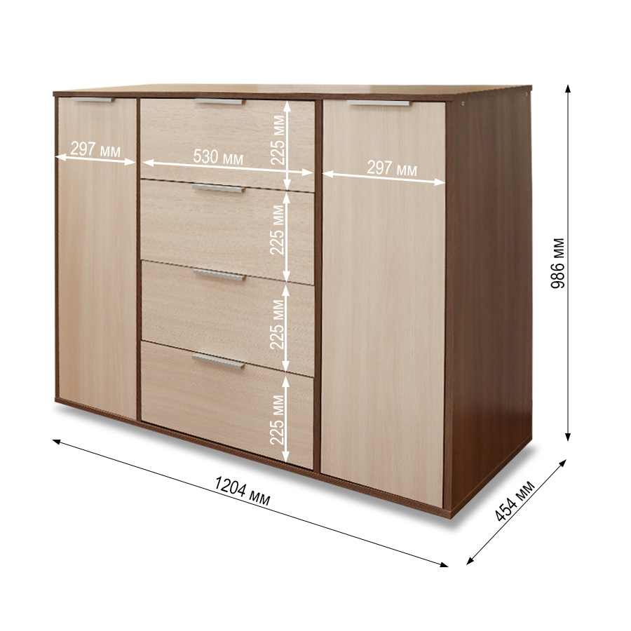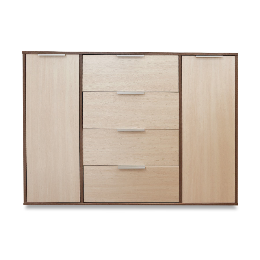 Комод оборудован просторными выдвижными ящиками и двумя дверцами, предоставляя разнообразные возможности для организации хранения. Вместительные ящики прекрасно подойдут для размещения одежды, белья и других личных предметов. Благодаря гармоничному сочетанию древесных оттенков, он будет уместен в любом интерьерном решении.